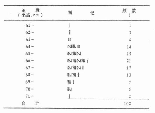 (四) 划线记数 像选举开票那样,将变量值逐个归入相应的组段,如将64.4归入“64-”组,63.8归入“63-”组。每归入一个变量值,在相应的组段内划一竖线,每逢第五线则作一横线跨在已划出的四条竖线上,这样五线连在一起最后计数时就很方便了。划完后将每个组段内的线条数写出,再将各组频数合计,频数表就编好了。