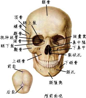 颅骨共23块(不包括3对听小骨),分为脑颅和面颅。 A total of 23 of the skull (not including three pairs of ossicles), divided into cranial and facial skull.